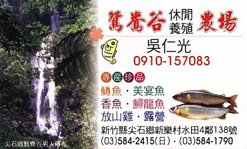 鴛鴦谷休閒養殖農場 鱒魚。美宴魚。香魚。鱘龍魚。放山雞。露營 電話:03-5842415 地址:新竹縣尖石鄉新樂村水田4鄰138號 |