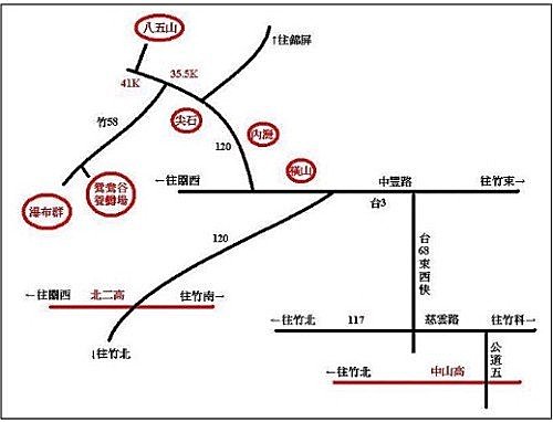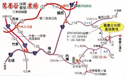 【交通位置】 〈中山高〉在新竹公道五交流道下→轉公道五往竹東→在慈雲路左轉往竹北→右轉台68東往竹東→在台68上轉往橫山→在中豐路(台3線)左轉往橫山→經過橫山國中後右轉120線道往內灣→經過內灣沿尖石鄉外環道直走→在120線道35.5K處左轉新樂大橋(竹58)→沿竹58往鴛鴦谷在約3.5K處即達。 〈北二高〉在竹林交流道下→轉120線道往竹東、橫山→在中豐路(台3線)左轉往橫山→經過橫山國中後右轉120線道往內灣→經過內灣沿尖石鄉外環道直走→在120線道35.5K處左轉新樂大橋(竹58)→沿竹58往鴛鴦谷在約3.5K處即達。 |