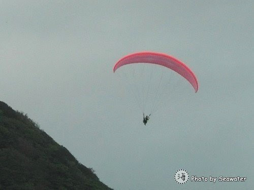▲空中不時的會有從萬里飛行場飛下來的飛行傘降落在沙灘